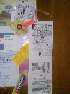 Kemudian gue akan memperkenalkan Yotsuba&! di bagian kanan attention board gue. Siapa atau apakah Yotsuba&!? Dia atau 'itu' adalah (tokoh) komik kesukaan gue hingga saat ini. Ceritanya, Yotsuba masih 5 taun n polos abis. Masih sangat tidak mengenal dunianya . Jadi kawands, saya sarankan kalian semua membacanya untuk mulai memandang hal-hal simpel di dunia ini dari kacamata anak umur 5 taun, n rasakan bedanya! Potongan komik ini bukan sengaja gue print demi hasta karya gw, tentu tidak. Jadi ceritanya gue emank demen nge-print komik ini. Nah, saat nge-print, terjadilah beberapa kesalahan. Yang salah-salah ntuh ga pernah gue buang (untungnya), karena gue tau bisa gue pake di kemudian hari. Jadilah salah duanya gue pake di sini. Selain buat promosi, juga bisa buat refreshing, hehehe....Di bagian tengahnya tentu saja info-info penting yang tidak boleh gue lupakan. Pertamanya gue pake double-tape busa, tapi setelah masa percobaan beberapa hari, double-tapenya ga nempel lagi. Jadi, gw mencari alternatif lain, yaitu dengan menggunakan penjepit kertas plastik. Yak! Dan ternyata emank lebih efektif dan murah.